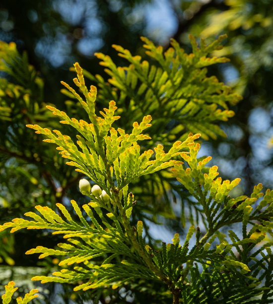 Le cèdre Thuja occidentalis L., ou thuya occidental, est un conifère de la famille des Cupressacées, originaire d’Amérique du Nord. Il peut atteindre 10 à 20 mètres de hauteur, avec un tronc droit et une écorce brun rougeâtre et fibreuse. Ses feuilles écailleuses, vert foncé et persistantes, sont disposées en paires opposées. Cet arbre, souvent pyramidal lorsqu’il est jeune, devient cylindrique avec l’âge.